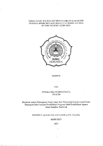 Pingka Helvi Rosaviana, NIM. 19116740 and Fuad Hasyim, M.Pd.I, . (2023) Peran Guru Pendidikan Agama Islam dalam menanamkan karakter peserta didik melalui kegiatan Rohis An-Nisa SMK Negeri 1 Kebumen. Diploma thesis, Institut Agama Islam Nahdlatul Ulama ( IAINU) Kebumen.