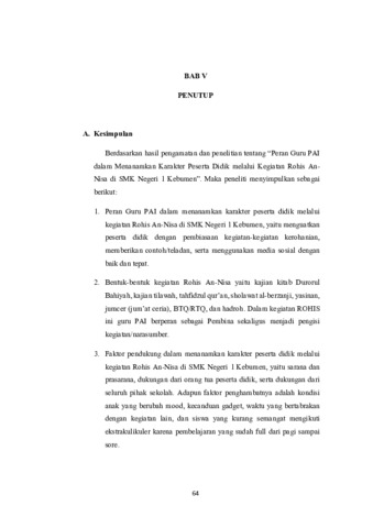 qur’an, sholawat al-berzanji, yasinan, jumcer (jum’at ceria), BTQ, RTQ, dan hadroh. Kegiatan-kegiatan tersebut memang sangat dibutuhkan oleh peserta didik. (2) Peran guru PAI dalam menanamkan karakter peserta didik sudah cukup baik. Diantaranya yaitu menguatkan peserta didik dengan pembiasaan-pembiasaan kegiatan kerohanian, memberikan contoh/teladan, serta menggunakan media sosial
