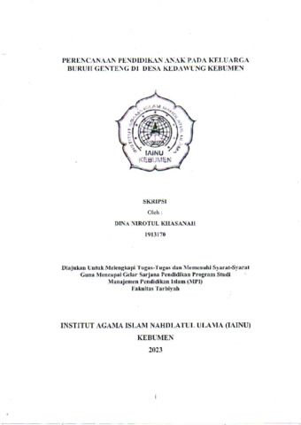 Dina Nirotul Khasanah, NIM.1913170 and Agus Salim Chamidi, M.Pd.I, . (2023) Perencanaan Pendidikan Anak Pada Keluarga Buruh Genteng di Desa Kedawung Kebumen. Diploma thesis, Institut Agama Islam Nahdlatul Ulama ( IAINU) Kebumen.