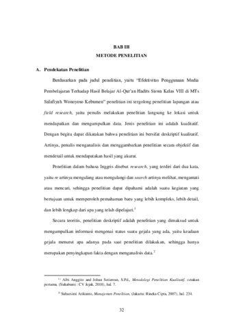 penelitian lapangan menggunakan metode kualitatif. Subyek penelitian ini terdiri dari seorang guru mata pelajaran Al-Qur’an Hadits siswa kelas Ⅷ. Teknik pengumpulan data dalam penelitian ini melalui observasi, wawancara dan