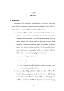 televisi, OHP, tape recorder. Prestasi belajar peserta didik sebelum penggunaan media sangat susah dan tampak kewalahan berbeda saat setelah penggunaan media peserta didik mengalami peningkatan utamanya mata pelajaran Al-Qur’an Hadits nilai setelah KKM hasilnya yaitu 62,5. Bentuk upaya efektifnya yaitu menjadikan media sebagai disiplin ilmu, penggunaan media dalam peningkatan hasil belajar,