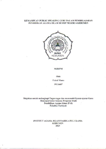 Faizul Muna, NIM.19116687 and Syifa Hamama, M.Si, . (2023) Kemampuan Public Speaking guru dalam Pembelajaran Pendidikan Agama Islam di SMP Negeri 6 Kebumen. Diploma thesis, Institut Agama Islam Nahdlatul Ulama ( IAINU) Kebumen.