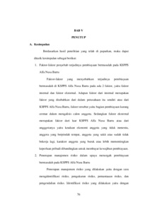 bermasalah di KSPPS Alfa Nusa Barru pada ada 2 faktor, yaitu faktor internal dan faktor eksternal. Adapun faktor dari internal merupakan faktor yang disebabkan dari dalam perusahaan itu sendiri atau dari KSPPS Alfa Nusa Barru, faktor tersebut yaitu bagian pembiayaan kurang cermat dalam mengalisis calon anggota. Sedangkan faktor eksternal merupakan faktor dari luar KSPPS Alfa Nusa Barru atau dari