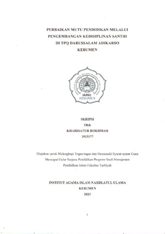 Kharisatur Rokhmah, NIM.1913177 and Agus Salim Chamidi, M.Pd.I, . (2023) Perbaikan Mutu Pendidikan Melalui Pengembangan Kedisiplinan Santri di TPQ Darussalam Adikarso Kebumen. Diploma thesis, Institut Agama Islam Nahdlatul Ulama ( IAINU) Kebumen.