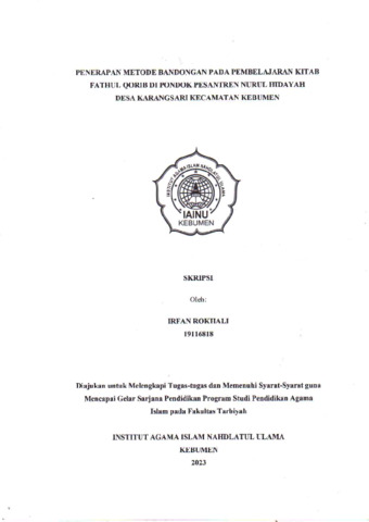 Irfan Rokhali, 19116818 and Dr. Eliyanto, M.Pd, 2108058801 (2023) Penerapan Metode Bandongan pada Pembelajran Kitab Fathul Qorib di Pondok Pesantren Nurul Hidayah Desa Karangsari Kecamatan Kebumen. Other thesis, IAINU Kebumen.