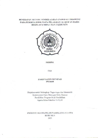 Zakiyyatun Munifah, 19116640 and Fibriyan Irodati, M.Pd.I, 2120029101 (2023) Penerapan Metode Pembelajaran Snowball Throwing Pada Peserta Didik Mata Pelajaran Al-Qur’an Hadis di Kelas X MIPA I MAN 3 Kebumen. Other thesis, IAINU Kebumen.