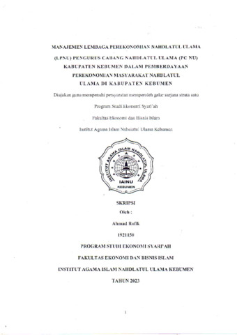 Ahmad Rofik, 1921150 and Mukhsinun, S.H.I., M.E.I., 2105038102 (2023) “Manajemen Lembaga Perekonomian Nahdlatul Ulama (LPNU) Pengurus Cabang Nahdlatul Ulama (PCNU) Kabupaten Kebumen Dalam Pemberdayaan Perekonomian Masyarakat Nahdlatul Ulama Di Kabupaten Kebumen. Other thesis, Institut Agama Islam Nahdlatul Ulama ( IAINU Kebumen).