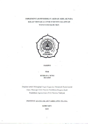 Fitriana Dewi, 18116505 and Sudadi, M.Pd.I., 2112105601 and Oky Ristya Trisnawati, M.Pd., 2106109102 (2023) Implementasi Pendidikan Akidah Akhlak Pada Kelas Viii Pasca Covid 19 Di Mts Salafiyah Wonoyoso Kebumen. Other thesis, Institut Agama Islam Nahdlatul Ulama ( IAINU Kebumen).