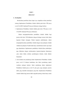 Tujuan penelitian adalah (1) Untuk mengetahui pendidikan akidah akhlak kelas VIII pasca covid 19 di MTs Salafiyah Wonoyoso Kebumen. (2) untuk mengetahui dampak pendidikan akidah akhlak kelas VIII pasca covid 19 di MTs Salafiyah Wonoyoso Kebumen. Penelitian in merupakan penelitian kualitatif dengan desain penelitian deskriptif. Data yang diperoleh dengan menggunakan observasi, wawancara dan dokumentasi dengan subjek penelitian kepala sekolah dan guru kelas VIII. Berdasarkan penelitian dapat disimpulkan bahwa; (1) bagaiman implementasi pendidikan akidah akhlak kelas VIII pasca covid 19 di MTs Salafiyah WonyosoKebumen. 2) mengetahui dampak pendidikan akidah akhalak kelas VIII pasca covid 19 di MTs Salafiyah Wonoyoso Kebumen. Pendidikan akhlak bagi peserta didik menjadi sangat penting. Karena salah satu tujuan pendidikan di MTs yaitu mencetak kader agama yang berakhlak mulia, berkepribadian yang luhur dan berwawasan keagamaan yang luas. Dengan demikian penelitian yang dilakukan, ternyata implementasi pendidikan akidah akhlak kelas VIII pasca covid 19 di MTs Salafiyah Wonoyoso Kebumen terlaksana dengan baik.