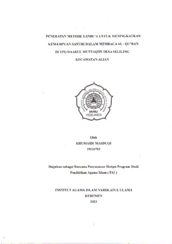 Khumaidi Masduqi, 19116783 and Isti'anah, M.A., 2120078001 (2023) Penerapan Metode Yanbu‟a Untuk Meningkatkan Kemampuan Santri dalam Membaca al – Qur‟an di TPQ Daarul Muttaqiin Desa Seliling Kecamatan Alian. Other thesis, Institut Agama Islam Nahdlatul Ulama ( IAINU Kebumen).