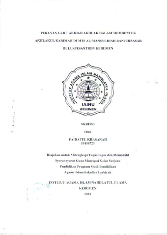 Faidatul Khasanah, 19116723 and Faisal, M.Ag., 2113027001 (2023) Peran Guru Akidah Akhlak dalam Membentuk Akhlakul Karimah di MTs Al-Mansyuriyah Banjurpasar Buluspesantren Kebumen. Other thesis, Institut Agama Islam Nahdlatul Ulama ( IAINU Kebumen).