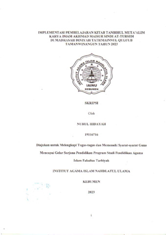 Nurul Hidayah, 19116716 and Faisal, M.Ag., 2113027001 (2023) Implementasi Pembelajaran Kitab Tanbihul Muta'alim Karya Imam Akhmad Maisur Sindi At-Tursidi di Madrasah Diniyah Tathmainnul Quluub Tahun 2023. Other thesis, Institut Agama Islam Nahdlatul Ulama ( IAINU Kebumen).