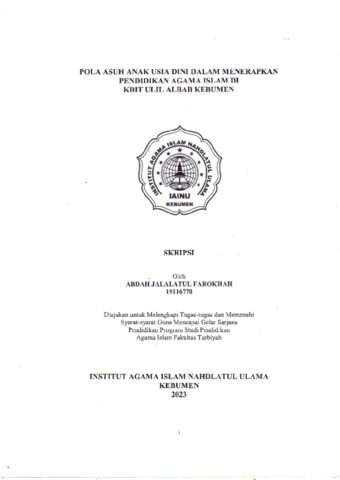 Abdah Jalalatul Farokhah, 19116770 and Devi Yaniar Wi Hargina, M.Pd.I., 2113018803 (2023) Pola Asuh Anak Usia Dini dalam Menerapkan Pendidikan Agama Islam di KBIT Ulil Albab Kebumen. Other thesis, Institut Agama Islam Nahdlatul Ulama ( IAINU Kebumen).