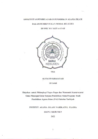 Alfiatin Khasanah, 18116468 and Imam Subarkah, M.Pd., 2129078202 and Oky Ristya Trisnawati, M.Pd., 2106109102 (2023) Efektivitas Pembelajaran Pendidikan Agama Islam Dalam Pembentukan Moral Religius Di SMK Ma’arif 6 Ayah. Other thesis, Institut Agama Islam Nahdlatul Ulama ( IAINU Kebumen).