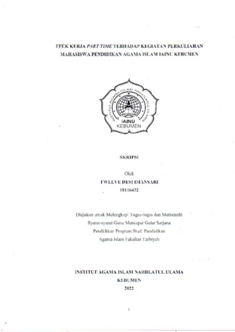Twelve Desi Imansari, 18116432 and Dr. Slamet Mujiono, S.Ag., M.Hum., 21070776601 and Dr. Atim Rinawati, M.Pd., 2126058701 (2023) Efek Kerja Part Time Terhadap Kegiatan Perkuliahan Mahasiswa IAINU Kebumen. Skripsi Institut Agama Islam Nahdlatul Ulama Kebumen. Other thesis, Institut Agama Islam Nahdlatul Ulama ( IAINU Kebumen).