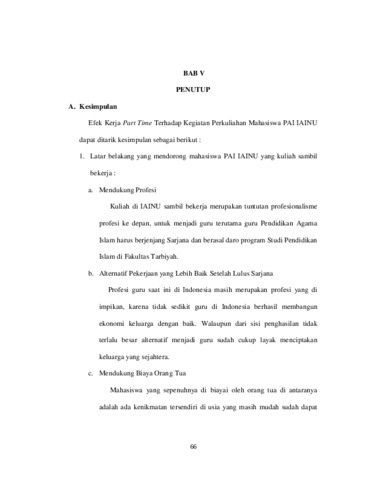 Penelitian ini bertujuan (1) untuk mengetahui latar belakang mahasiswa PAI IAINU Kebumen melakukan kuliah sambil bekerja. (2) untuk mengetahui apa saja efek kerja part time terhadap kegiatan perkuliahan mahasiswa PAI IAINU Kebumen. Penelitian ini berupa penelitian lapangan. Penelitian ini menggunakan Pendekatan Kualitatif. Subyek dalam penelitian ini adalah mahasiswa semester 8 yang kuliah sambil bekerja. Metode pengumpulan data yang digunakan adalah wawancara serta dokumentasi. Sedangkan teknik analisis data menggunakan reduksi data, penyajian data, serta penarikan kesimpulan. Hasil penelitian ini dapat disimpulkan bahwa: (1) latar belakang yang mendorong mahasiswa PAI IAINU Kebumen yang kuliah sambil bekerja: untuk mendukung profesi, alternatif pekerjaan yang lebih baik setelah lulus sarjana, mendukung biaya orang tua, meningkatkan pengetahuan. (2) efek kerja part time terhadap kegiatan perkuliahan: (a) efek terhadap menajemen waktu antara kuliah dan bekerja, (b) efek terhadap proses pembelajaran, (c) efek terhadap evaluasi, ujian dan praktikum, (d) efek terhadap prestasi dan indeks prestasi.