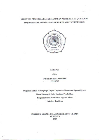 Indah Sukmaningsih, NIM. 19116763 and Dr. Benny Kurniawan, M.Pd.I., 2110068702 (2023) Strategi Peningkatan Kemampuan Membaca Al Qur‟an di TPQ Darussalam Desa Bandung Kecamatan Kebumen. Other thesis, Institut Agama Islam Nahdlatul Ulama ( IAINU Kebumen).