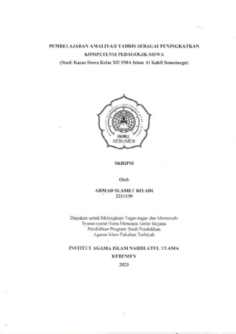 Ahmad Slamet Riyadi, NIM. 2211150 and Imam Subarkah, M.Pd., 2129078202 (2023) Pembelajaran Amaliyah Tadris Sebagai Peningkatkan Kompetensi Pedagogik Siswa (Studi Kasus Siswa Kelas XII SMA Islam Al Kahfi Somalangu). Other thesis, Institut Agama Islam Nahdlatul Ulama ( IAINU Kebumen).