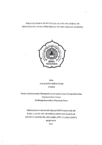 Salasatun Khasanah, NIM. 1932094 and Syifa Hamama, S.I.Kom., M.Si.., 2116028603 (2023) Strategi Dakwah Penyuluh Agama Islam Dalam Mengurangi Angka Perceraian di Kecamatan Klirong. Other thesis, Institut Agama Islam Nahdlatul Ulama ( IAINU Kebumen).