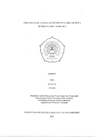 Isnaeni, NIM. 19116658 and Dr. Eliyanto, M.Pd.I., 2108058801 (2023) Strategi Guru PAI dalam Membentuk Akhlak Siswa di SMK Ma’arif 7 Kebumen. Other thesis, Institut Agama Islam Nahdlatul Ulama ( IAINU Kebumen).