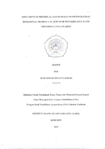 MUHAMMAD HIZAM MASRURI, NIM. 19116793 and Dr. Ali Mahfudz, M.S.I., 2114028602 (2023) Implementasi Metode Al-Insyirah dalam Meningkatkan Kemampuan Membaca Al-Qur’an di MI Tarbiyatul Ulum Tirtomoyo Poncowarno. Other thesis, Institut Agama Islam Nahdlatul Ulama ( IAINU Kebumen).