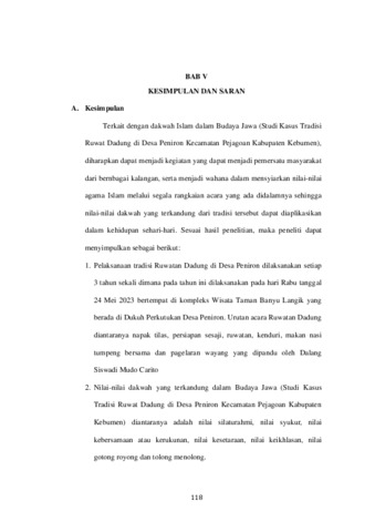 terhadap fenomena yang terjadi dan mendokumentasikan data tersebut. Kemudian data tersebut dianalisis menggunakan metode deskriptif kualitatif yang dimaksudkan untuk mendeskripsikan situasi yang bersifat fakta. Data yang terkumpul dianalisis menggunakan reduksi data, penyajian data, dan verifikasi data. Hasil penelitian ini menyimpulkan bahwa pelaksanaan tradisi Ruwatan Dadung di Desa Peniron dilaksanakan setiap 3 tahun sekali dimana pada tahun ini dilaksanakan pada hari Rabu tanggal 24 Mei 2023 bertempat di kompleks Wisata Taman Banyu Langik yang berada di Dukuh Perkutukan Desa Peniron. Urutan acara Ruwatan Dadung diantaranya napak tilas, persiapan sesaji, ruwatan, kenduri, makan nasi tumpeng Bersama dan pergelaran wayang. Peregalaran wayang tersebut dipandu oleh Dalang Siswadi Mudo Carito. Adapun nilai-nilai dakwah yang terkandung dalam Budaya Jawa (Studi Kasus Tradisi Ruwat Dadung di Desa Peniron Kecamatan Pejagoan Kabupaten Kebumen) diantaranya adalah nilai silaturahmi, Syukur, kebersamaa atau kerukunan, kesetaraan, keikhlasan, gotong royong dan tolong menolong.