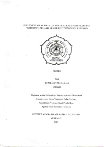 Dewi Suci Maharani, NIM. 19116608 and Dr. Sudadi, M.Pd.I., NIDN. 2112105601 (2023) Implementasi Kurikulum Merdeka pada Pembelajaran Fiqih di MTs Ma‟arif Lumbu Kutowinangun Kebumen. Other thesis, Institut Agama Islam Nahdlatul Ulama ( IAINU Kebumen).