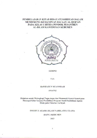 Hanifatun Muannisah, NIM. 19116762 and Dr. H.M Bahrul Ilmie, S.Ag., M.Hum., NIDN. 212110037101 (2023) Pembelajaran Kitab Hidayatus Shibyan Dalam Mendukung Kemampuan Bacaan Al-Qur‟an Pada Kelas 1 Ibtida Pondok Pesantren Al-Islam Kawedusan Kebumen. Other thesis, Institut Agama Islam Nahdlatul Ulama ( IAINU Kebumen).