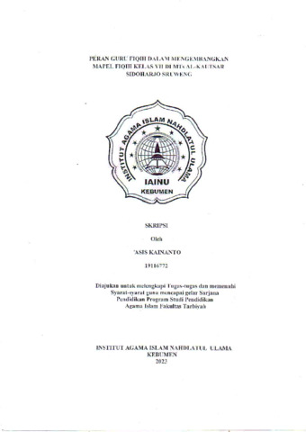Asis Kainanto, NIM. 19116772 and Nuraini Habibah, S.Ag., M.S.I., NIDN. 2107047501 (2023) Peran Guru Fiqih Dalam Mengembangkan Mapel Fiqih kelas VII di MTs Al-Kautsar Sidoharjo Sruweng. Other thesis, Institut Agama Islam Nahdlatul Ulama ( IAINU Kebumen).
