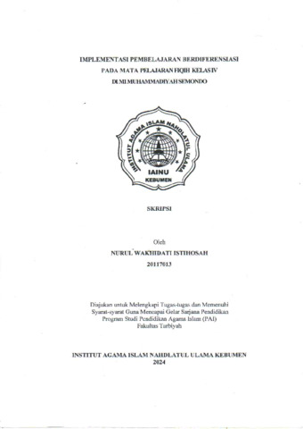 Nurul Wakhidati Istihosah, NIM. 20117013 and Siti Fatimah, M.Pd., NIDN. 2114028901 (2024) Implementasi Pembelajaran Berdiferensiasi pada Mata Pelajaran Fiqih Kelas IV di MI Muhammadiyah Semondo. Other thesis, Institut Agama Islam Nahdlatul Ulama ( IAINU Kebumen).