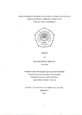 Kuat Rachmat Hidayat, NIM.19116784 (2023) Peran Boarding School dalam Menanamkan Nilai-nilai Akhlak di Lingkungan SMK Ma‟arif 5 Gombong. Diploma thesis, IAINU Kebumen.