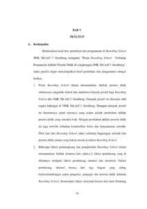 kesimpulan. Berdasarkan hasil penelitian yang diperoleh menunjukkan bahwa peran Boarding School dalam menannamkan akhlak pada peserta didik di lingkungan SMK Ma‟arif 5 Gombong sangatlah efektif dan memiliki pengaruh yang besar