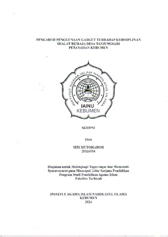 Siti Mutoharoh, NIM. 20116934 and Dr. Benny Kurniawan, M.Pd.I., NIDN. 211008702 (2024) Pengaruh Penggunaan Gadget Terhadap Kedisiplinan Shalat Remaja Desa Tanjungsari Petanahan Kebumen. Other thesis, Institut Agama Islam Nahdlatul Ulama ( IAINU Kebumen).