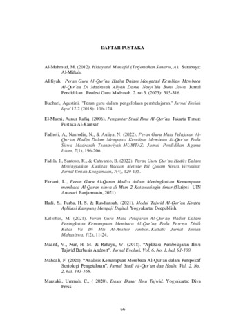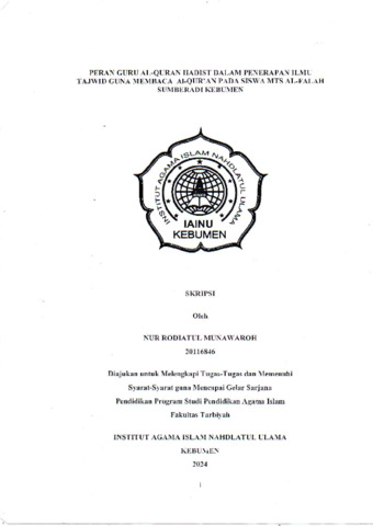 Nur Rodiatul Munawaroh, NIM. 20226846 and Drs. H. Mahrur Adam Maulana, M.Ag., NIDN. 2107076601 (2024) Peran guru Al-Qur'an Hadist dalam Penerapan Ilmu Tajwid guna Membaca Al-Qur'an pada Siswa MTs Al-Falah Sumberadi Kebumen. Other thesis, Institut Agama Islam Nahdlatul Ulama ( IAINU Kebumen).