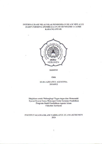 Elda Ajizatul Agustina, NIM. 20116912 and Dr. Eliyanto, M.Pd.I., NIDN. 2108058801 (2024) Internalisasi Nilai-nilai Pendidikan Islam Melalui Habit Forming (Pembiasaan) di SD Negeri 1 Candi Karanganyar. Other thesis, Institut Agama Islam Nahdlatul Ulama ( IAINU Kebumen).