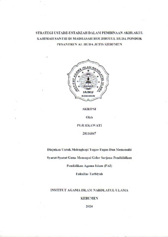PUJI EKAWATI, NIM.20116847 (2024) Strategi Ustadz-Ustadzah dalam Pembinaan Akhlakul Karimah Santri di Madrasah Roudhotul Huda Pondok Pesantren AlHuda Jetis Kebumen. Diploma thesis, IAINU Kebumen.