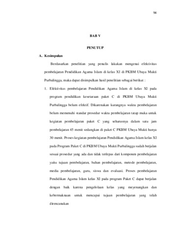 Berdasarkan hasil penelitian dapat disimpulkan bahwa: (1) Efektivitas pembelajaran Pendidikan Agama Islam di kelas XI pada program pendidikan kesetaraan paket C di PKBM Ubaya Mukti Purbalingga belum efektif. Dikarenakan kurangnya waktu pembelajaran belum memenuhi standar prosedur waktu pembelajaran tatap muka untuk kegiatan pembelajaran paket C yang seharusnya dalam satu jam pembelajaran 45 menit sedangkan di paket C PKBM Ubaya Mukti hanya 30 menit. Proses kegiatan pembelajaran Pendidikan Agama Islam kelas XI