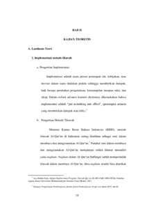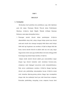 Isnaturosidah. 20116873. Implementasi Metode Tilawah Dalam Pembelajaran Membaca Al-Qur‟an Santri Majelis Tilawah Al-Badar Bumirejo Kebumen. Tujuan Penelitian adalah untuk mengetahui pelaksanaan pembelajaran membaca Al-Qur‟an dengan metode tilawah santri Majelis Tilawah Al-Badar Bumirejo Kebumen, untuk mengetahui capaian hasil pembelajaran membaca AlQur‟an dengan metode tilawah santri Majelis Tilawah Al-Badar Bumirejo Kebumen, untuk mengetahui kendala yang dihadapi dan solusi yang dilakukan dalam penelitian pembelajaran membaca Al-Qur‟an dengan metode tilawah santri