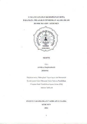 Annisa Taqwawati, NIM.20116943 (2024) Upaya Penanaman Kedisiplinan Siswa Pada Mata Pelajaran Pendidikan Agama Islam di SMK Ma’arif 1 Kebumen. Diploma thesis, IAINU Kebumen.