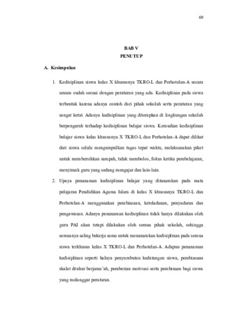 penarikan kesimpulan. Hasil penelitian menunjukan bahwa; (1) kedisiplinan belajar di kelas X yaitu TKRO-L dan Perhotelan-A sudah terbentuk, karena SMK Ma’arif 1 Kebumen menerapkan pembiasaan kedisiplinan siswa seperti halnya shalat dzuhur