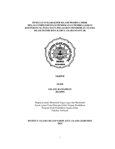 Gilang Ramadhan, NIM.20116994 (2024) Penguatan Karakter Islami Peserta Didik Melalui Implementasi Pendekatan Pembelajaran Kontekstual pada Mata Pelajaran Pendidikan Agama Islam di SMK Bina Karya 1 Karanganyar. Diploma thesis, IAINU Kebumen.