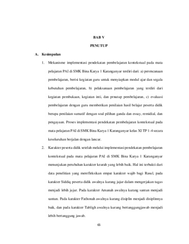 Karanganyar. (2) mengetahui bagaimana karakter Islami peserta didik SMK Bina Karya 1 Karanganyar setelah implementasi pembelajaran kontekstual pada mata