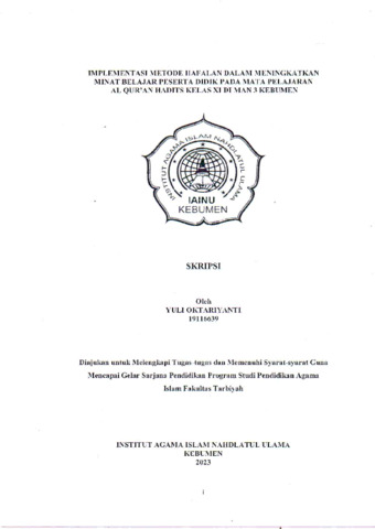 Yuli Oktariyanti, NIM. 19116639 and Fuad Hasyim, M.Pd.I., NIDN. 2126028801 (2023) Implementasi Metode Hafalan Dalam Meningkatkan Minat Belajar Peserta Didik pada mata Pelajaran Al Qur‟an Hadits Kelas XI Di MAN 3 Kebumen Tahun Pelajaran 2023/2024. Other thesis, Institut Agama Islam Nahdlatul Ulama ( IAINU Kebumen).