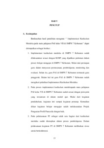 data. Berdasarkan hasil penelitian dapat disimpulkan bahwa : (1) implementasi kurikulum merdeka di SMPN 7 Kebumen telah dilaksanakan dengan baik sesuai dengan KOSP yang ada di SMPN 7 Kebumen terutama dari proses implementasi