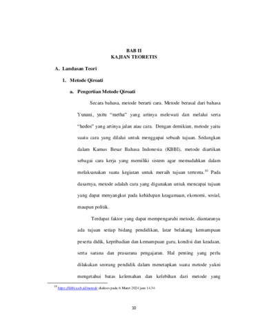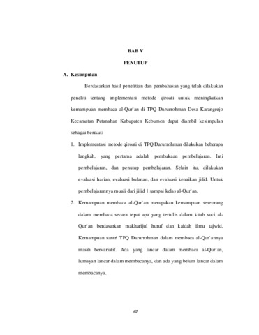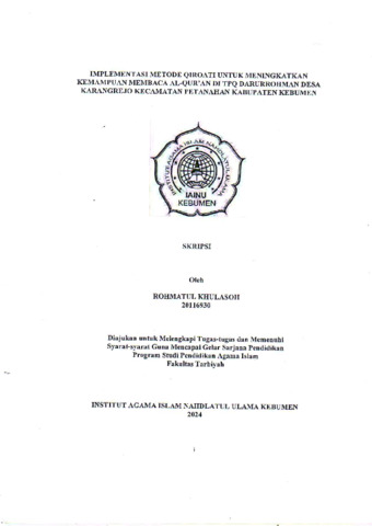 Rohmatul Khulasoh, NIM.20116930 (2024) Implementasi Metode Qiroati Untuk Meningkatkan Kemampuan Membaca Al-Qur`an Di TPQ Darurrohman Desa Karangrejo Kecamatan Petanahan Kabupaten Kebumen. Diploma thesis, IAINU Kebumen.