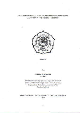 Fitria Kurnianti, NIM. 20116829 and Dr. Imam Subarkah. M.Pd., NIDN. 2129078202 (2024) Pengaruh Motivasi terhadap Kemampuan Menghafal Al-Qur’an di SMK Negeri 1 Kebumen. Other thesis, Institut Agama Islam Nahdlatul Ulama ( IAINU Kebumen).