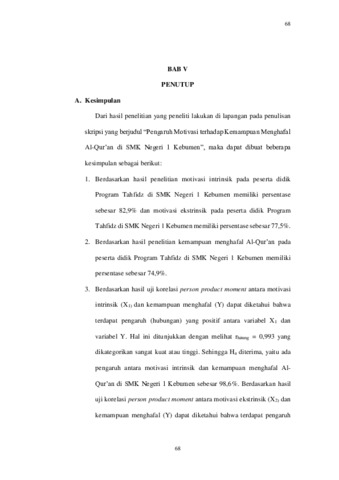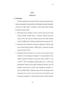 Tujuan penelitian adalah: (1) Untuk mengetahui persentase nilai motivasi dalam menghafal Al-Qur’an pada Program Tahfidz di SMK Negeri 1 Kebumen. (2) Untuk mengetahui persentase nilai kemampuan peserta didik dalam menghafal Al-Qur’an pada Program Tahfidz di SMK Negeri 1 Kebumen. (3) Untuk mengetahui besarnya pengaruh motivasi terhadap kemampuan menghafal Al-Qur’an pada peserta didik Program Tahfidz di SMK Negeri 1 Kebumen. Penelitian ini berupa Penelitian Kuantitatif dengan jenis penelitian korelasional. Responden yang diteliti adalah peserta didik SMK Negeri 1 Kebumen yang mengikuti Program Tahfidz. Metode yang digunakan dalam penelitian ini adalah metode kuantitatif. Data yang dikumpulkan berupa data kuesioner. Teknik analisis data yang digunakan adalah uji instrument penelitian (uji validitas dan uji reliabilitas), uji asumsi (uji normalitas dan uji linearitas), analisis statistik deskriptif, dan analisis korelasi product moment. Berdasarkan hasil penelitian dapat disimpulkan bahwa: (1) Berdasarkan hasil penelitian deskripsi, motivasi intrinsik pada peserta didik Program Tahfidz di SMK Negeri 1 Kebumen memiliki persentase sebesar 82,9% dan motivasi ekstrinsik pada peserta didik Program Tahfidz di SMK Negeri 1 Kebumen memiliki persentase sebesar 77,5%. (2) Berdasarkan hasil penelitian deskripsi, kemampuan menghafal Al-Qur’an pada peserta didik Program Tahfidz di SMK Negeri 1 Kebumen memiliki persentase sebesar 74,9%. (3) Berdasarkan hasil uji korelasi product moment antara motivasi intrinsik (X1) dan kemampuan menghafal (Y) dapat diketahui bahwa terdapat pengaruh (hubungan) yang positif antara variabel X1 dan variabel Y. Hal ini ditunjukkan dengan melihat rhitung = 0,993 yang dikategorikan sangat kuat atau tinggi. Sehingga Ha diterima, yaitu ada pengaruh antara motivasi intrinsik dan kemampuan menghafal Al-Qur’an di SMK Negeri 1 Kebumen sebesar 98,6%. Berdasarkan hasil uji korelasi product moment antara motivasi ekstrinsik (X2) dan kemampuan menghafal (Y) dapat diketahui bahwa terdapat pengaruh (hubungan) yang positif antara variabel X2 dan variabel Y. Hal ini ditunjukkan dengan melihat rhitung = 0,986 yang dikategorikan sangat kuat atau tinggi. Sehingga Ha diterima, yaitu ada pengaruh antara motivasi ekstrinsik dan kemampuan menghafal Al-Qur’an di SMK Negeri 1 Kebumen sebesar 97,2%.