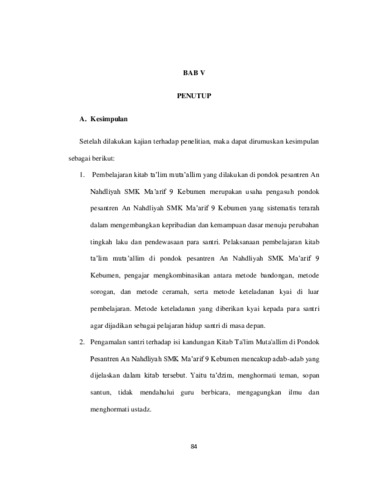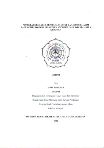 Isnin Marlina, NIM. 20116968 and Fibriyan Irodati, M.Pd.I., NIDN. 2120029101 (2024) Pembelajaran Akhlak Melalui Kitab Ta’lim Muta’alim Bagi Santri Pondok Pesantren An Nahdliyah SMK Ma’arif 9 Kebumen. Other thesis, Institut Agama Islam Nahdlatul Ulama ( IAINU Kebumen).