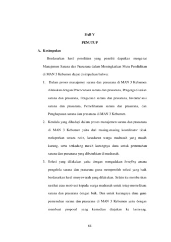 prasarana; (2) kendala yang dihadapi yaitu kurangnya kesadaran warga madrasah dalam pemeliharaan dan pemanfaatan sarana dan prasarana, masing-masing koordinator bidang tidak melaporkan secara rutin, serta masih kurangnya dana dalam pemenuhan sarana dan prasarana; (3) Solusi yang dilakukan yaitu mengadakan breefing dari pengelola sarana dan prasarana, memberikan nasihat atau motivasi kepada warga madrasah untuk memelihara sarana dan prasarana