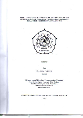 Ana Rizki Fatimah, 1812830 (2022) Efektivitas Penggunaan Metode Role Playing Dalam Pembelajaran Keterampilan Berbicara Bahasa Jawa Kelas III di SD Negeri Keditan Magelang. Diploma thesis, IAINU Kebumen.